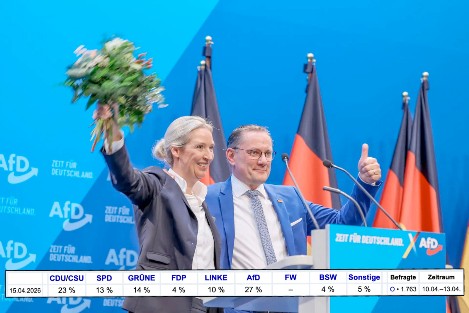 Samtidigt går Socialdemokraterna tillbaka till 13 procent. De gröna ökar till 14 procent och Die Linke till 10 procent.