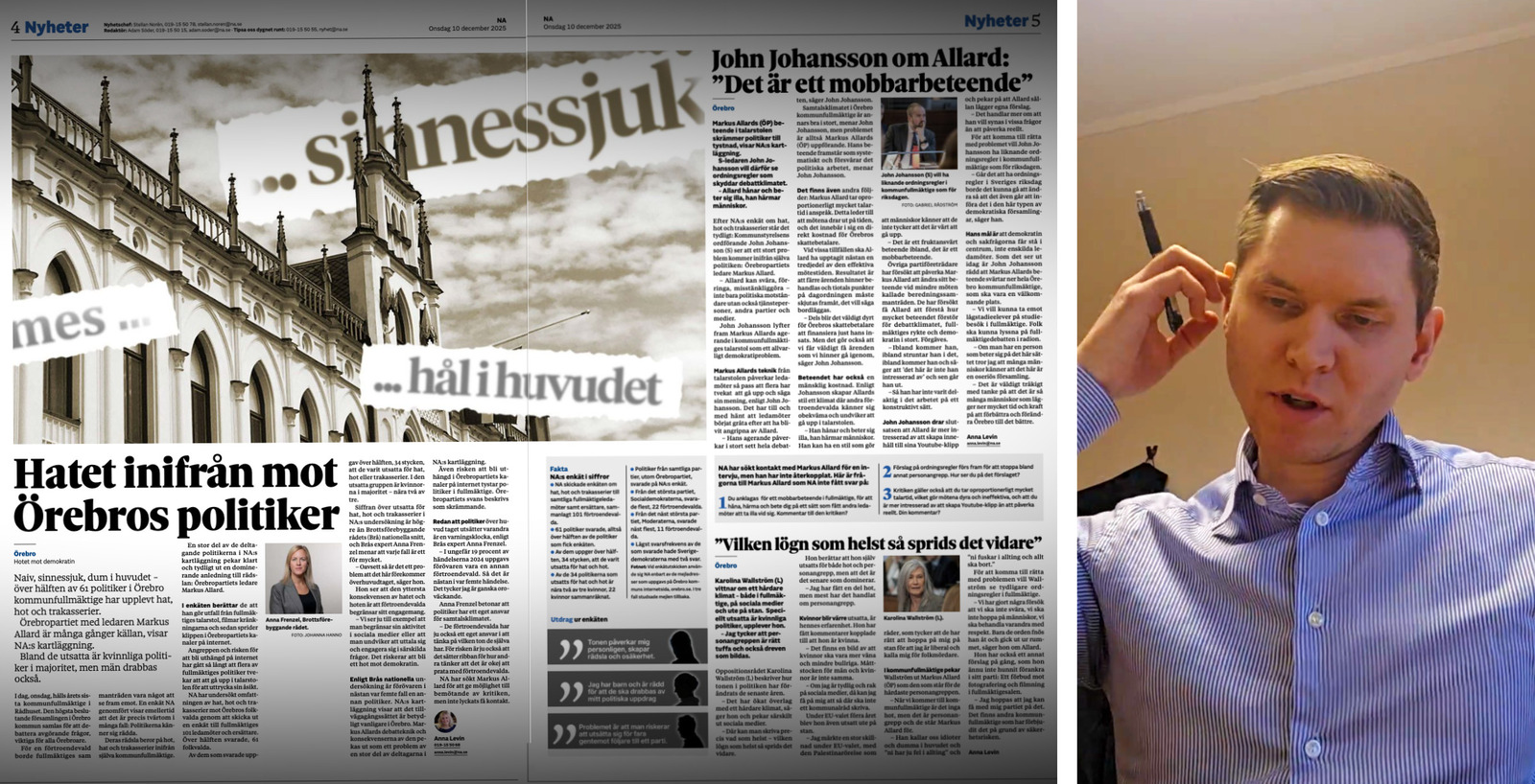 I centrum står Örebropartiets ledare Markus Allard, som enligt tidningen skulle vara orsaken till att flera politiker känner sig otrygga. Men nu visar Allard själv att materialet som NA baserar sina artiklar på kommer från en mycket tvivelaktig enkät.
