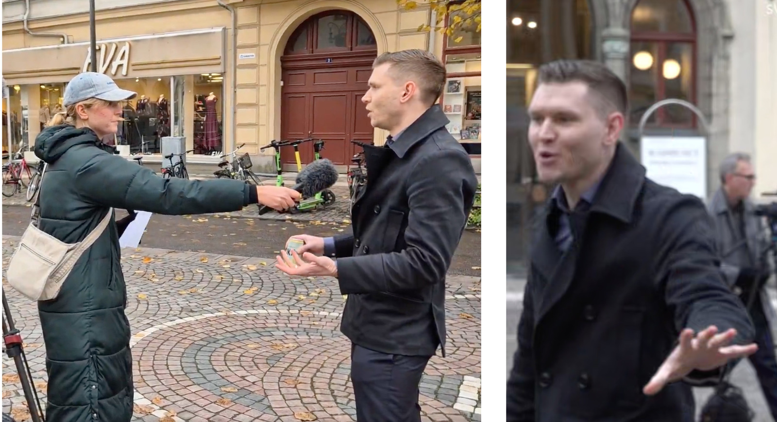 Därefter avbryter partiledaren abrupt intervjun och vägrar att svara när SVT-reportern försöker ställa fler frågor. Istället lämnar han platsen.