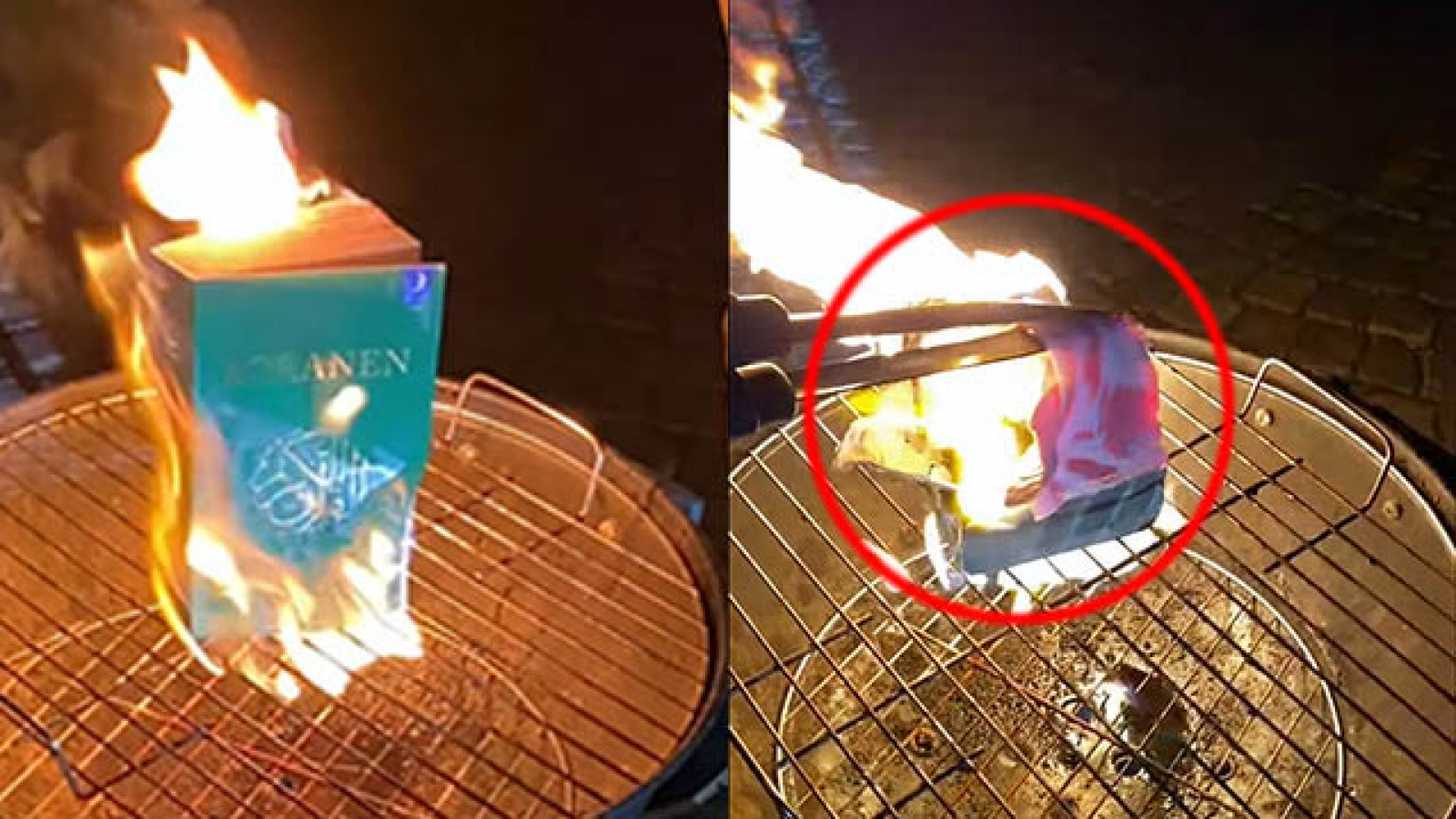 Medan den muslimska boken brann försökte aktivisterna använda elden för att grilla bacon, något som dock inte verkar ha varit särskilt effektivt. De som ligger bakom koranbränningen misstänks nu ha begått åsiktsbrott.