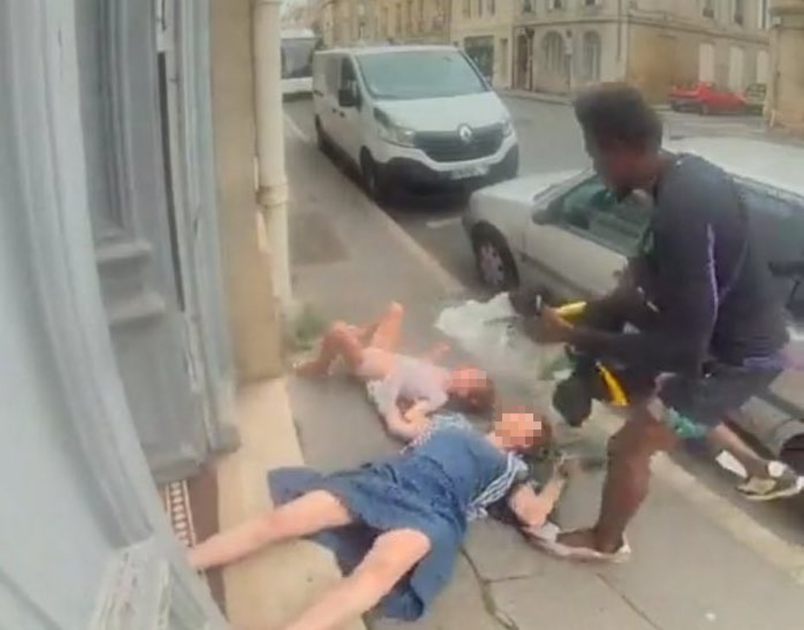 En övervakningsvideo visar hur en afrikan angriper den 73-åriga kvinnan och den 7-åriga flickan när de är på väg in i en port. Han riktar slag mot dem och kastar ned dem på trottoaren.