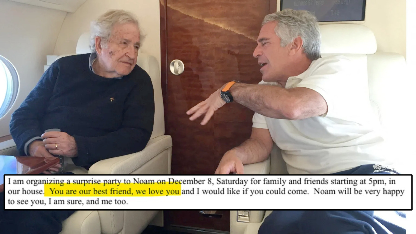 I ett mejl daterat den 24 oktober 2018, undertecknat av hustrun Valeria Chomsky, bjuds Epstein in till en överraskningsfest för Chomsky.