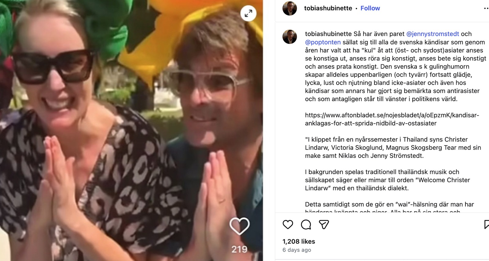 "Igår lade jag ut jag nedanstående inlägg på mitt Instagram-konto som hittills har registrerat över 150 000 visningar", skriver Tobias Hübinette på sin blogg.