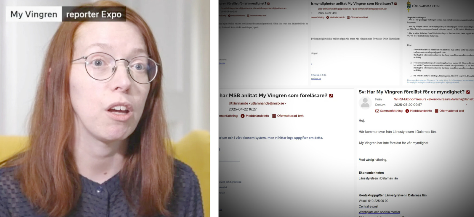 På sin hemsida och på Linkedin påstår My Vingren att hon "regelbundet" håller föreläsningar för och utbildar personalen på flera centrala myndigheter inom säkerhet och rättsväsende. Men i Petersons granskning uppger Polismyndigheten, Försvarsmakten, MSB, Domstolsverket och landets tingsrätter att de inte har några uppgifter om att My Vingren anlitas som föreläsare eller expert – trots att hon påstår sig arbeta med dem.