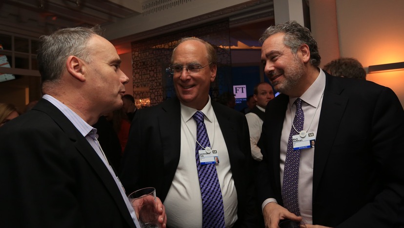 Larry Fink, i mitten, tar över vid rodret i Världsekonomiskt forum.