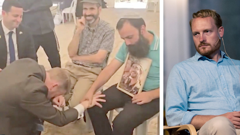 Sverigedemokraternas kulturpolitiske talesperson Alexander Christiansson går ned på knä inför en israelisk bosättare i Jerusalem. Nu vill partiets utrikespolitiska talesperson Aron Emilsson göra mer för Israel i Tidöförhandlingarna.