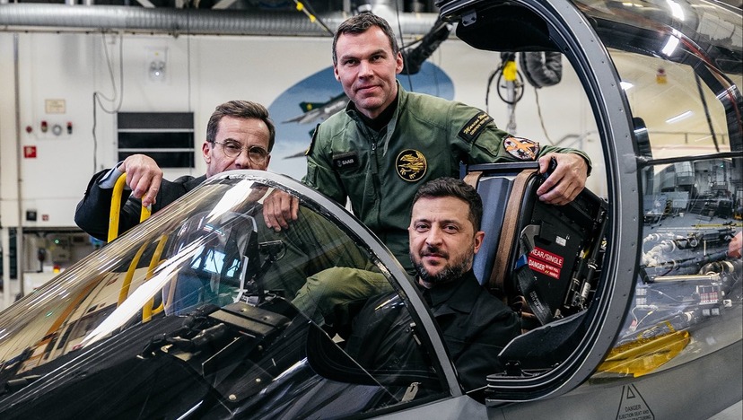 Zelenskyj provsitter i en Jas Gripen under onsdagens besök hos Saab i Linköping.