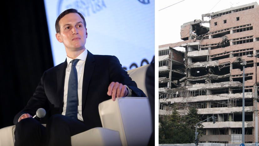 Generalstabs-komplexet skadades i Natos bombningar av Serbien år 1999, som dödade 500 civila. Till vänster: Jared Kushner.
