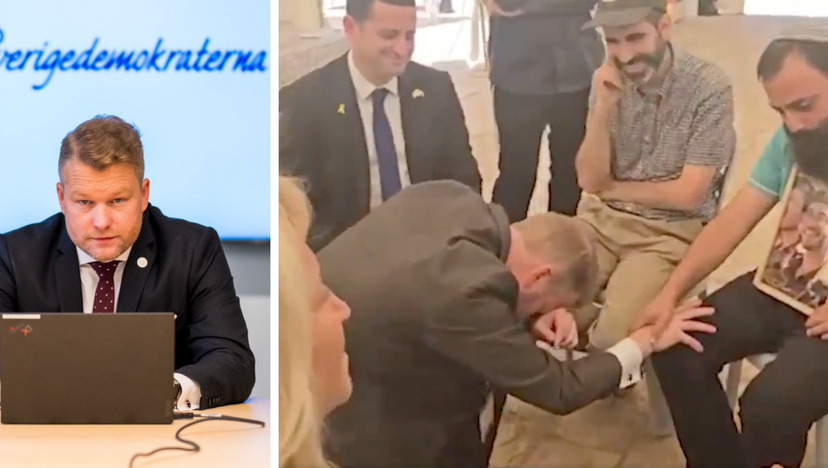 Israelerna på mötet brast ut i skratt när Alexander Christiansson (SD) gick ned på knä och skakande började storgråta inför bosättaren.