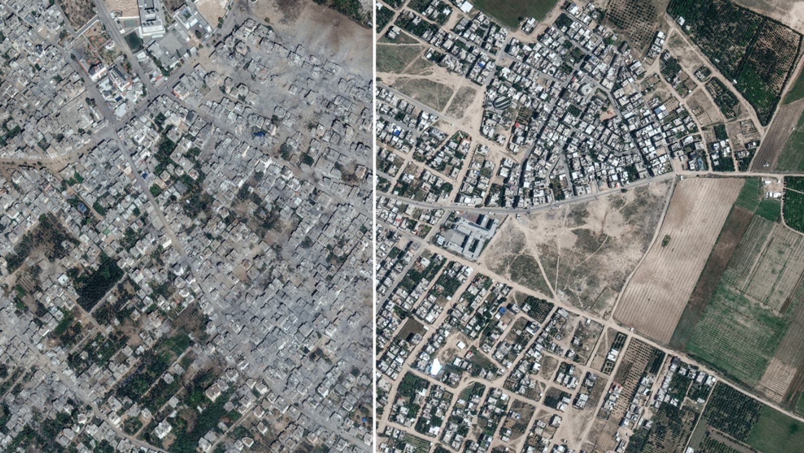 Område i norra Gaza, före och efter Israels demoleringskampanj.