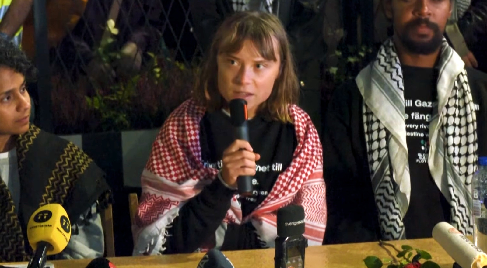– Det som hände var inte bara att Israel kidnappade och torterade oss utan att, framför allt, under pågående eskalerande folkmord där Israel uttalat försöker radera hela Gazaremsan och det palestinska folket, Israel återigen bröt internationell rätt och förhindrade humanitär hjälp, sa Greta Thunberg.