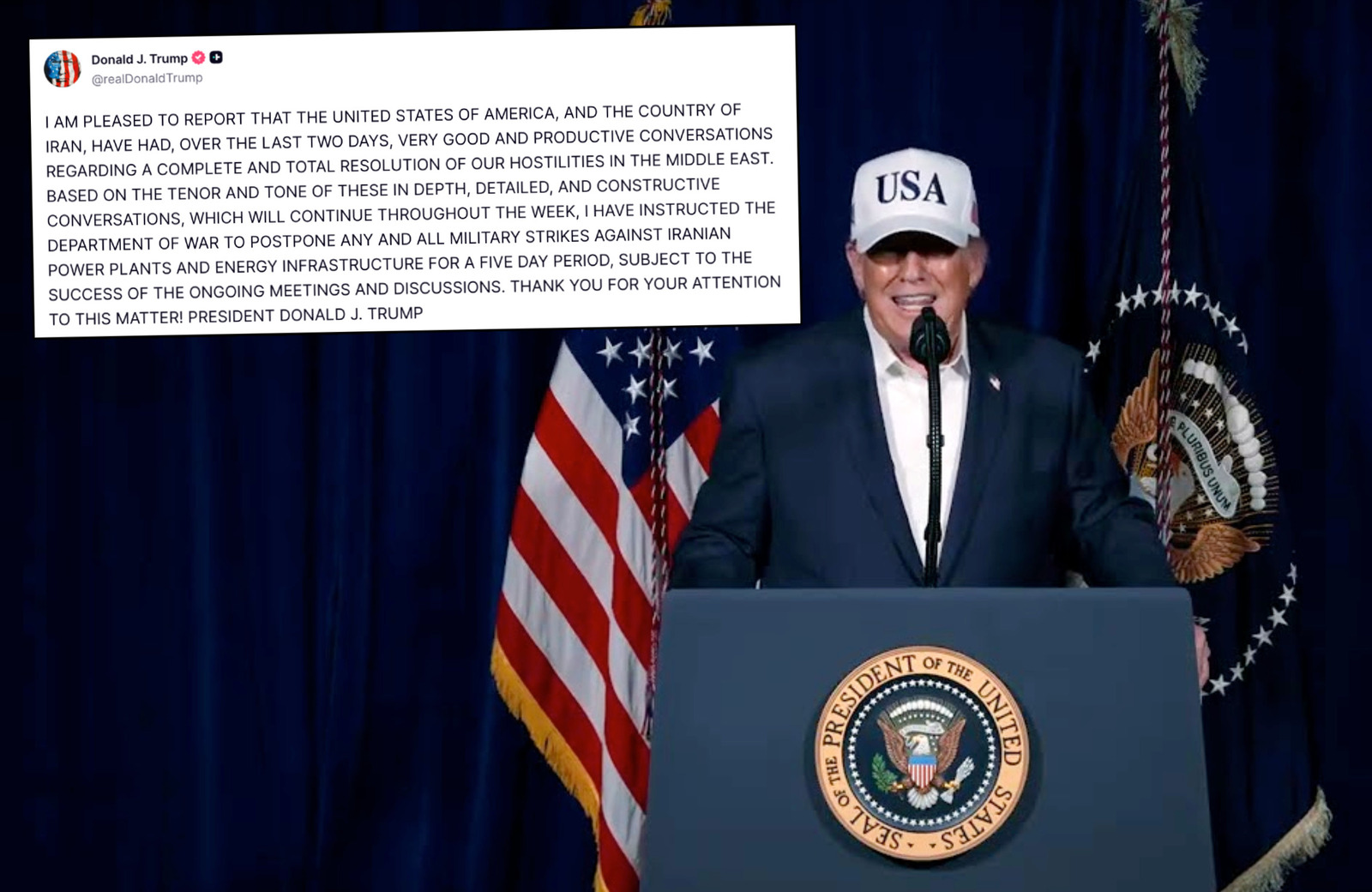 "Baserat på tonen i dessa djupgående, detaljerade och konstruktiva samtal, som kommer att fortsätta under hela veckan, har jag instruerat krigsdepartementet att skjuta upp alla militära angrepp mot iranska kraftverk och energiinfrastruktur i fem dagar, under förutsättning att de pågående mötena och diskussionerna lyckas", skriver han.
