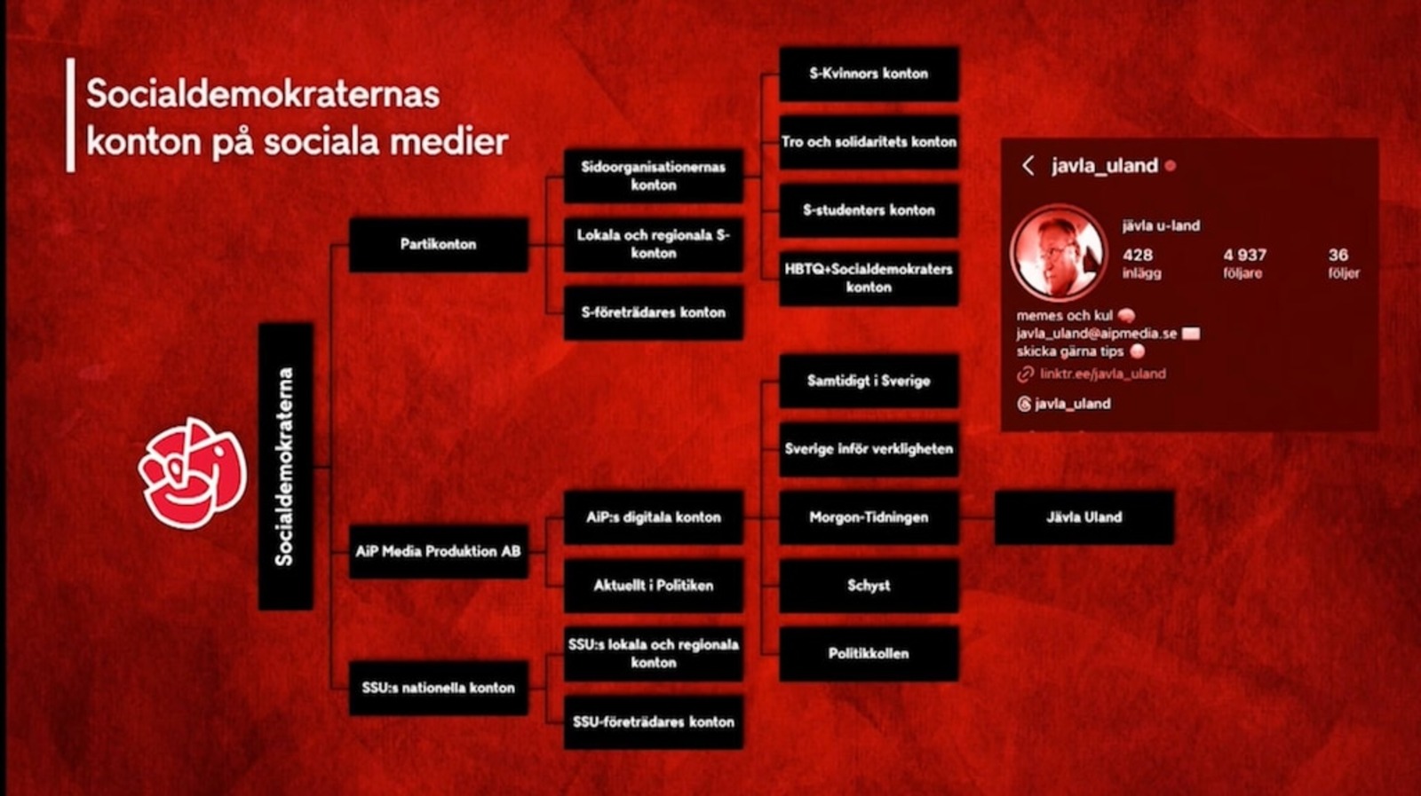 Granskningen från TV4 Nyheterna visar att Socialdemokraterna via sitt mediebolag AiP driver politiskt vinklade sajter och sociala mediekonton där det inte alltid framgår att ett partiägt bolag ligger bakom.