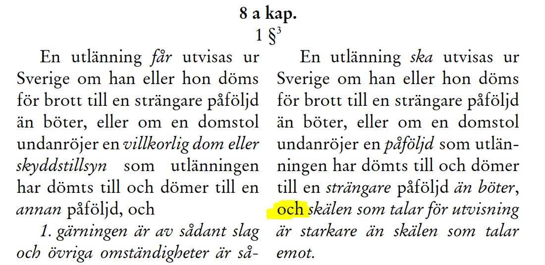 Notera det lilla ordet "och". Tidögänget ändrar visserligen formuleringen "får utvisas" till "ska utvisas" – men samtidigt uppställs ett villkor: skälen som talar för utvisning ska vara starkare än skälen som talar emot.