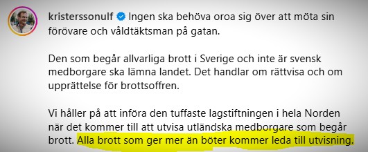 Inlägget ovan är från Instagram under gårdagen, där Ulf Kristersson tar avstamp i våldtäkten av Meya Åberg för att marknadsföra sitt pågående lagförslag med fejkade skärpningar av utlänningslagens utvisningsregler.