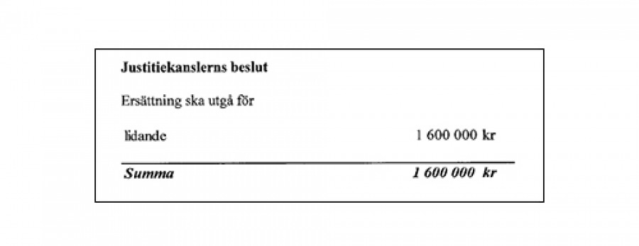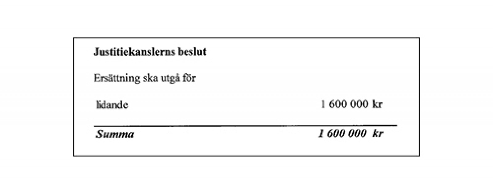 JK hänvisar till den praxis som finns när det gäller ersättning för lidande i samband med felaktiga frihetsberövanden och kommer fram till totalbeloppet 1,6 miljoner.