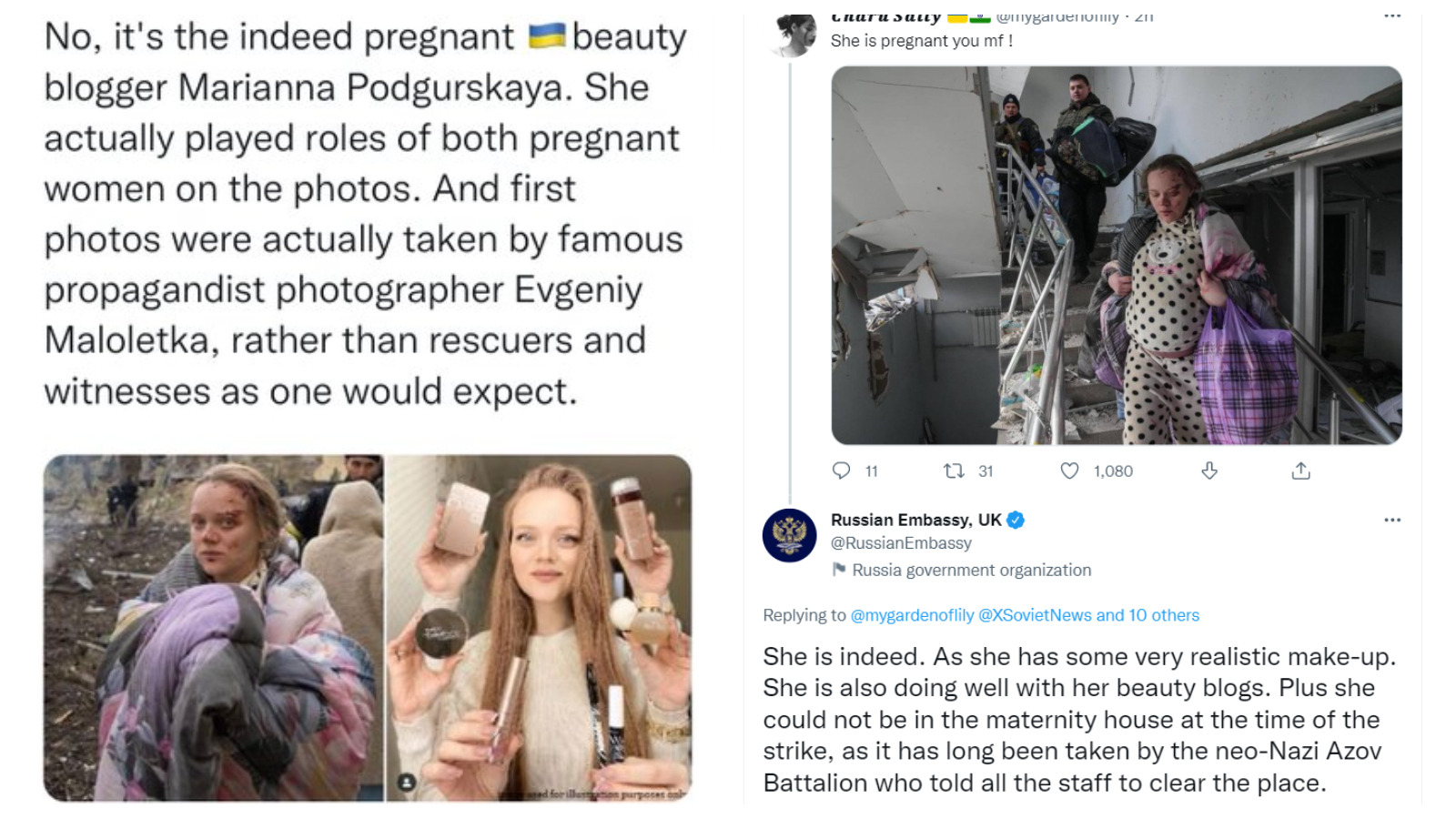 – Hennes namn är Marianna Podgurskaja, hon spelar tre "gravida kvinnor" på en gång, sminkade på olika sätt, och hon återfinns även på andra bilder tagna av samma fotograf, Yevgeny Maloletka, som skildrar tragedin i Ukraina. Denne fotograf samarbetar med Associated Press, New York Times och så vidare, sade Rysslands FN-representant Dmitry Polyanskiy.