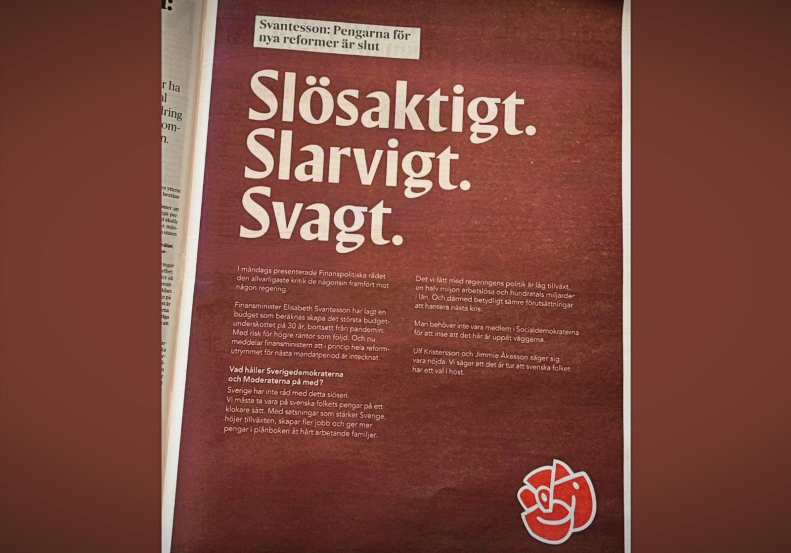 Socialdemokraterna har i annonser beskrivit regeringens politik som ”slösaktigt”, ”slarvigt” och ”svagt”.