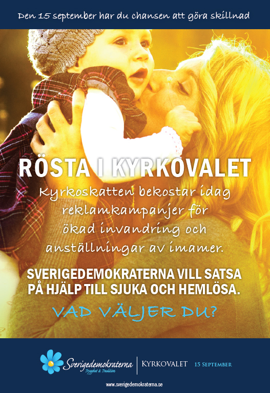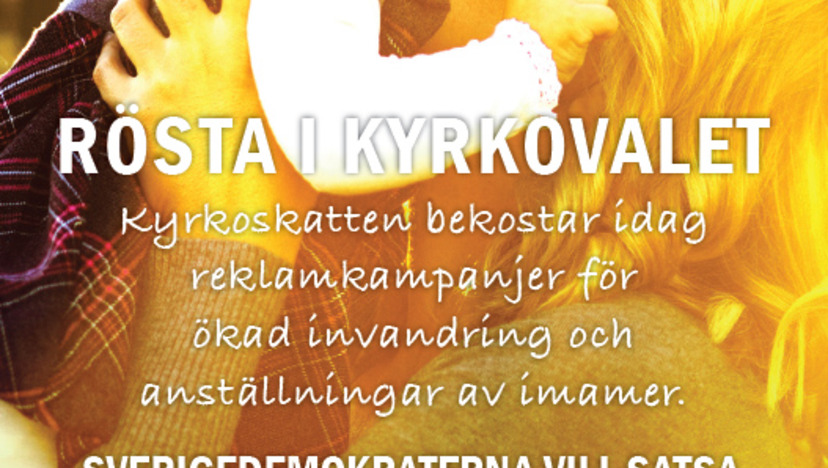 Även en annan av partiets annonser har fått kalla handen av flera tidningar. Kyrkoskatten bekostar idag reklamkampanjer för ökad invandring och anställning av imamer. Sverigedemokraterna vill satsa på hjälp till sjuka och hemlösa, står det i en annons som bland annat Helsingborgs Dagblad, Nynäsposten och Norra Skåne har vägrat att ta in.