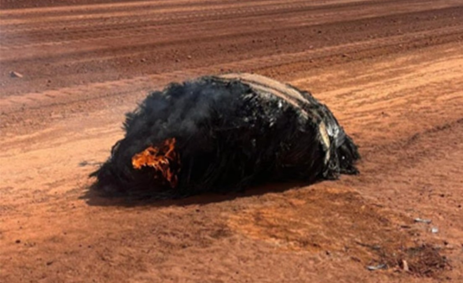 På bilder som spridits av myndigheter syns föremålet ligga brinnande på den röda sanden. Andra foton visar dess svarta, utbrända skal efter att elden släckts.